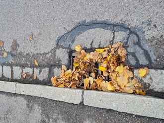 Straßeneinlaufschächte, die so mit Laub bedeckt sind, verlieren ihre Funktion, weil Niederschlagswasser nicht mehr ungehindert ablaufen kann!