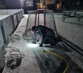 Dank des großen Einsatzes unserer „Eismeister“ Thomas Träger und Thomas Köhle verwandelte sich die Freizeitfläche an der Robert-Bosch-Straße in eine Eisbahn - sehr zur Freude aller großen und kleinen Kufenflitzer. Die Besucherzahlen waren beeindruckend! Damit die Eisfläche trotz intensiver Nutzung in gutem Zustand bleibt, werden täglich Unebenheiten durch das Auffüllen mit Wasser ausgeglichen. Über Nacht bildet sich dann eine neue Eisschicht, die vor der nächsten Nutzung gegebenenfalls noch von Schnee befreit werden muss.