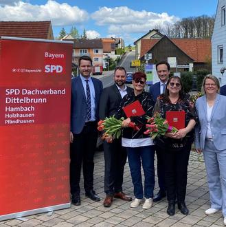 Der Vorsitzende des Dachverbandes der SPD in der Gemeinde Dittelbrunn und 2. Bürgermeister Holger Schmitt betonte in seiner Begrüßung die Bedeutung der Arbeit der Partei in den Gemeindeteilen. Man habe sich zum Ziel gesetzt, alle Gemeindeteile gleichermaßen im Blick zu haben, insbesondere das Vereinsleben, die Nahversorgung und die Kinderbetreuung stünden hier im Mittelpunkt. Der SPD sei es immer gelungen, durch engagierte Gemeinderäte die Interessen der Pfändhauser und Holzhäuser im Gemeinderat zu vertreten. Besonders freute sich Schmitt über den Besuch von Landrat Florian Töpper. Dieser lobte die Arbeit der Gemeinde-SPD und konnte gemeinsam mit dem Bundestagsabgeordneten Markus Hümpfer und der SPD-Kreisvorsitzenden Kreisrätin Martina Braum (Röthlein) zwei Mitglieder der Orts-SPD für jahrzehntelange Treue zur Partei auszeichnen. Petra Bohn fand vor 40 Jahren über ihren Vater, den langjährigen Ortsvereins-Vorsitzenden Günter Bohn zu den Sozialdemokraten und ist seitdem verlässliche Stütze der Partei in Pfändhausen. Die überzeugte Gewerkschafterin Angelika Markert trat vor 25 Jahren bei, fungiert schon seit 2002 als Holzhäuser Gemeinderätin und bringt sich so vielfältig in die Gemeindepolitik ein. Gleichzeitig ist sie die Vorsitzende des SPD-Ortsvereins Pfändhausen/Holzhausen. Glückwünsche der SPD in Poppenhausen zum Jubiläum überbrachte deren Vorsitzender Manfred Breitenbach. Besonders erinnerte die Versammlung an den früh verstorbenen Pfändhäuser Gemeinderat Erich Kamionka und an den Gründungsvorsitzenden Klaus Schubert.
