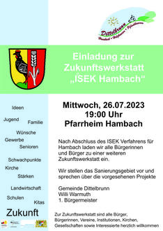 Weil es mir nach der geringen Bürgerbeteiligung während des Verfahrens, besonders wichtig erscheint, Ihnen das Ergebnis des Integrierten (nachhaltigen) Städtebaulichen Entwicklungskonzeptes für den GT Hambach im Ergebnis vorzustellen, weise ich nochmals auf die „Zukunftswerkstatt“ Hambach am 27.07.2023 um 19:00 Uhr voraussichtlich im Pfarrheim in Hambach hin. Hier wollen wir neben der Vorstellung auch die möglichen Projekte vorstellen und ihre Priorisierung besprechen.