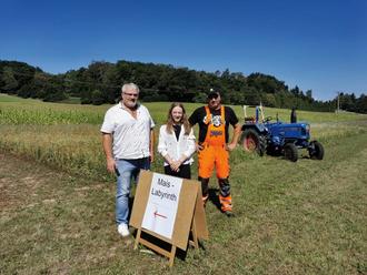 das Dittelbrunner Maislabyrinth, das Michael Hofmann in diesem Jahr auf einem Gemeindegrundstück erstmals angelegt hat, ist fertig. Der Erstbegang bei herrlichem Wetter ist erfolgreich geschafft.