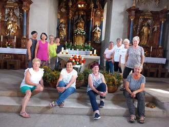 16 Frauen vom Frauenbund Hambach haben auch in diesem Jahr vor Maria Himmelfahrt wieder Kräutersträuße gebunden. Die Düfte mitbegrachter Pflanzen mischen sich.