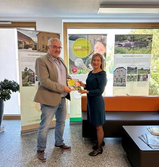 Start der Ausstellung Grün im Dorf. Das Bild zeigt 1. Bürgermeister Herrn Willi Warmuth und Baudirektorin Frau Bollermann vom Amt für Ländliche Entwicklung Unterfranken.