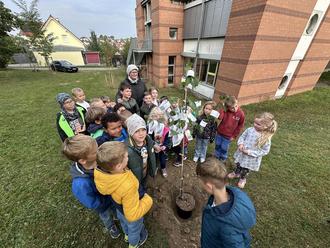Traditionsgemäß ging es in den ersten Wochen nach der Einschulung für unsere 1. Klassen zum Baumpflanzen. Die Klasse 1b in Hambach und 1a und 1c in Dittelbrunn bekamen von mir jeweils einen Ringlo-Baum. Gemeinsam mit Miguel und Dominik vom gemeindlichen Bauhof wurden diese Bäume eingepflanzt und jeweils ein Lied „Stark wie ein Baum“ gesungen. Die Kinder versprachen mir, sich auch um IHREN Baum zu kümmern. In Dittelbrunn