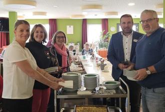 Prominent serviert: Unter Anleitung von Pflegedienstleitung Lejla Gallagher (v.l.n.r.) servierten Martina Gießübel (MdL), Ulrike Hahn (AWO Fachbereichsleitung Alter & Pflege), Stefan Rottmann (Bezirksvorstand AWO Unterfranken) und Willi Warmuth (1. Bürgermeister Dittelbrunn)