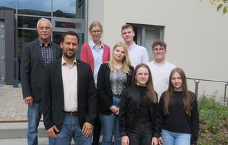 im Bild, von links Hinten : Konrad Bonengel, Geschäftsleiter Werneck, Eva Fenn, ILE Umsetzungsbegleitung, Leon Naujoks, Niederwerrn, Mitte : Sebastian Hauck, 1. Bürgermeister, Magdalena Göbel, Geldersheim, Niklas Johannydes, Poppenhausen, vorne : Leona Mansius, Dittelbrunn, Michelle Wischer, Markt Werneck