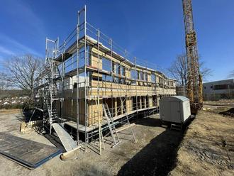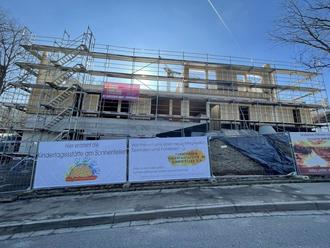 Der Bau unserer Kita am Sonnenteller geht voran. Vergangene Woche wurden die vorgefertigten Holzbauwände und -Decken, geliefert.
