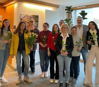 Zum Weltfrauentag besuchte uns die Gleichstellungsbeauftragte der Gemeinde Dittelbrunn, Ute Hofmann, um den Kolleginnen eine Blumengruß zu überreichen. Die Kolleginnen freuten sich über diese schöne Geste. Mit gutem Gewissen können wir sagen, dass die überwiegende Zahl der Führungspositionen in der Gemeinde Dittelbrunn mit Kolleginnen besetzt sind. Nicht aus dem Grund, dass sie Frauen sind und wir irgendwelche Quoten erfüllen müssen, sondern weil sie sich durch fachliche und soziale Kompetenzen für die jeweiligen Stellen Qualifiziert haben. Übrigens genau aus dem selben Grund sind manche Führungspositionen auch mit Männern besetzt.