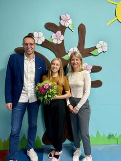 Torsten Dohnalek und KiTa-Leiterin Caroline Baum begrüßen die "Neue" mit einem Blumenstrauß.