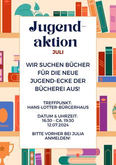 Elli und Julia wollen am 12.07.2024 von 16.30 – 19.30 Uhr mit Euch in die Buchhandlung Riemann nach Coburg fahren um spannenden Lesestoff für den neuen Jugendbereich in der Gemeindebücherei auszusuchen und vielleicht auch gleich mitzunehmen. Das heißt, ihr könnt mitbestimmen, was für Lesestoff zukünftig im neuen Jugendbereich zu finden sein wird.