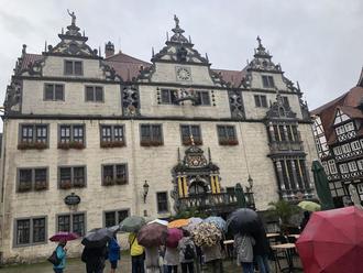 Das Renaissance-Rathaus in Hannoversch Münden wird bewundert (erbaut um 1200, Schmuckfassade fertiggestellt 1608)