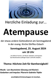 | 18.00 Uhr | Atempause – der musikalische Gottesdienst am Sonntagabend „Höchste Zeit für Barmerzigkeit“ – musikalische Ausgestaltung: Lars Baumeister (Gesang und Klavier), Gedanken und Impulse: Pfarrerin Gabriele Töpfer |