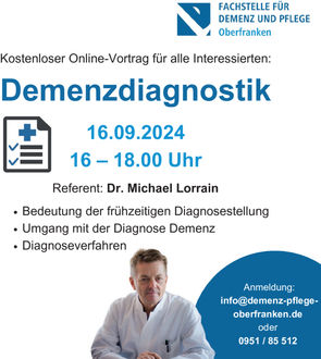 Dr. Lorrain bringt im Rahmen des Vortrages allen Interessierten die Diagnostik von Demenzerkrankungen näher. Er thematisiert die Bedeutung einer frühzeitigen Diagnose, konkrete Diagnoseverfahren sowie den Umgang mit der Diagnose Demenz. Zudem beantwortet Dr. Michael Lorrain häufig auftretende Fragen aus seiner beruflichen Praxis. Im Anschluss an den Vortrag können themenspezifische Fragen an den Referenten und das Team der Fachstelle für Demenz und Pflege Oberfranken gestellt werden.