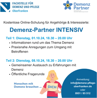 Im Anschluss an die Bayerische Demenzwoche lädt die Fachstelle für Demenz und Pflege Oberfranken am Dienstag, 1. Oktober 2024 von 18.30 bis 20.00 Uhr zur kostenlosen Online-Demenz Partner-Schulung ein. Ergänzt wird die Schulung durch einen zweiten Online-Termin am Dienstag, 8. Oktober 2024, ebenfalls von 18.30 bis 20.00 Uhr, bei dem die Fragen der Teilnehmenden zum Thema Demenz beantwortet werden.