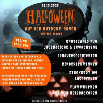 Wir laden herzlich ein zur großen Halloween-Sause auf der Outdoor-Ranch. Wie im letzten Jahr könnt ihr leckeren Flammkuchen, Stockbrot und ein Heißgetränk am Lagerfeuer genießen. Wem die Verkleidung allein nicht reicht, kann sich beim Kinderschminken schön schaurig schminken lassen. Für den richtigen Grusel-Faktor sorgen dann noch Ellis Gruselgeschichten sowie der Gruselwald für Jugendliche und Erwachsene.