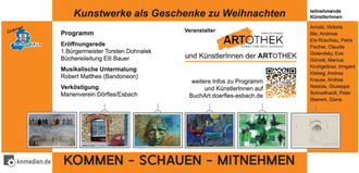 Die Artothek Dörfles-Esbach und ihre Künstler:innen laden Sie recht herzlich zu unserem 1. KunstKaufMarkt ins Hans-Lotter-Bürgerhaus ein. Es erwartet Sie ein stimmungsvoller Abend mit Kunst und Musik und Leckerem vom Marienverein. Sie haben schon etwas anderes vor. Kein Problem sie können ganz entspannt erst zum Essen gehen, oder die Vorstellung unserer Theatergruppe genießen. Kommen Sie einfach Vorher oder im Anschluss auf ein Glas Wein vorbei. Unser Markt hat bis 22 Uhr für Sie geöffnet. Besuchen Sie unsere Auftaktveranstaltung und finden Besonderes zum Schenken oder Selber behalten.
