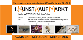 Die Artothek Dörfles-Esbach und ihre Künstler:innen laden Sie recht herzlich zu unserem 1. KunstKaufMarkt ins Hans-Lotter-Bürgerhaus ein.