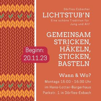 Gemeinsames stricken, häkeln, sticken und basteln ist im Hans-Lotter-Bürgerhaus ab den 20.11.2023 möglich. Hier können sowohl Groß und Klein zusammen ihre Kreativität ausleben und sich gegenseitig unterstützen. Die Dörfles-Esbacher Lichtstub´n findet montags von 15:00 bis 16:00 Uhr im Bürgerhaus statt. Ist die kreative Ader geweckt worden? Dann schaut gerne bei uns vorbei, wir freuen uns auf Euren Besuch!