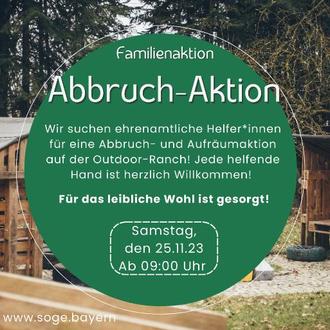 Am Samstag, den 25.11.2023 ab 09:00 Uhr findet eine große Abbruch- und Aufräumaktion auf der Ranch statt. Hierfür benötigen wir ehrenamtliche Helfer*innen, welche uns tatkräftig unterstützen möchten. Natürlich wird für das leibliche Wohl der Helfer*innen gesorgt. Gibt es unter Euch helfende Hände? Dann meldet Euch gerne bei uns per Telefon oder E-Mail.