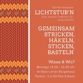 Gemeinsames stricken, häkeln, sticken und basteln ist im Hans-Lotter-Bürgerhaus ab jetzt möglich. Hier können sowohl Groß und Klein als auch Alt und Jung zusammen ihre Kreativität ausleben und sich gegenseitig unterstützen. Die Dörfles-Esbacher Lichtstub´n findet montags von 15:00 bis 16:30 Uhr im Bürgerhaus statt. Ist die kreative Ader geweckt worden? Dann schaut gerne bei uns vorbei! Auf Ihren Besuch freuen Sich Andrea Hink und Silke Lindemann.