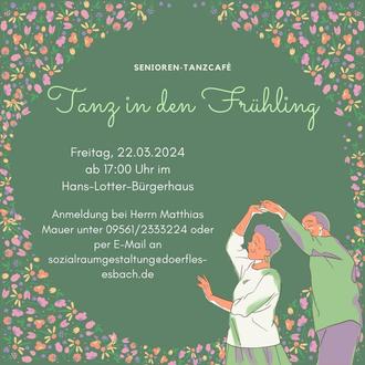 Unser erstes Tanzcafé in diesem Jahr steht unter den Vorzeichen des endlich nahenden Frühlings. So wollen wir am 22. März 2024 gemeinsam mit Ihnen bei toller Musik von 17.00 – 19.00 Uhr in den Frühling hineintanzen und gemeinsam eine schöne Zeit verbringen.