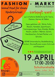 Zum inzwischen achten Mal findet am Freitag den 19. April 2024 der Fashion-Markt für Erwachsene in der Emil-Fischer-Schule in Dörfles-Esbach statt. In der Zeit von 17.00 - 20.00 Uhr können gepflegte und modische Damen- und Herrenoberbekleidung für Frühjahr/Sommer (Shirts, Pullis, Blusen, Hemden, Sporthosen, Trainingsanzüge, Tops, Kleider, Röcke, Hosen, Jacken/Mäntel, Gürtel, Handtaschen, Schals/Tücher und Schuhe) erworben werden.