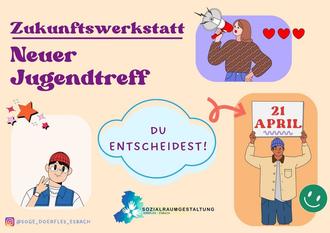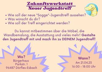 Den neuen Jugendtreff findest du im Bürgerhaus, Parkstraße 1, hinter der katholischen Kirche. Aber wie soll er aussehen? Wir brauchen deine Ideen. Also komm zur Zukunftswerkstatt am Freitag, dem 21. April 2023, ab 16.00 Uhr.