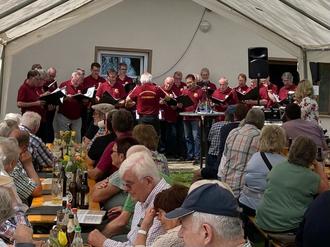 Bei strahlendem Sonnenschein wurden auch einige Ehrungen längjähriger Sänger und Mitglieder vorgenommen. Klaus Bock, Vorsitzender der Sängergruppe Forchheimer Oberland, nahm die Ehrungen der aktiven Sänger vor. Geehrt wurden Dr. Stefan Harbeck für 10 Jahre mit der bronzenen Ehrennadel des Fränkischen Sängerbundes und Werner Fritz für 25 Jahre mit der silbernen Ehrennadel und einer Dankurkunde des Fränkischen Sängerbundes Singen im Chor. Weiter wurde Günther Thiele für 50 Jahre und Rudolf Gold für 65 Jahre Mitgliedschaft im MGV Steinbach mit einem Ehrenpreis ausgezeichnet. Rudolf Gold war aber nicht nur für viele Jahre Mitglied, sondern hat auch 62 Jahre aktiv gesungen und war 24 Jahre 1. Vorstand des MGV Steinbach.