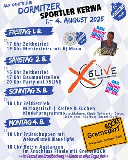 Familiennachmittag am Sonntag mit Kinderschminken, Hüpfburg, Kleinfeld-Soccer, Kutschfahrten, Kinderflohmarkt und klassischen Kerwaständen wie Los- und Schießbude. Infos und Anmeldung zum Kinderflohmarkt unter www.fcdormitz.de