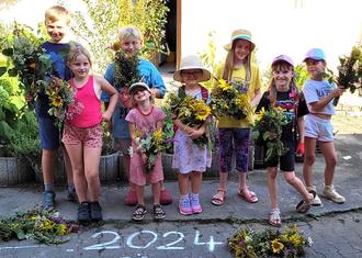 Trotz der hohen sommerlichen Temperaturen machten sich acht Kinder und einige Erwachsene auf, um verschiedene Kräuter zu sammeln. Ein Wurzbüschl sollte mindestens aus 7 Kräuter bestehen. Wir haben allerdings viel mehr gefunden. Es durfte unter anderen die Schafgarbe, der Reinfarn, der Odermenning, das Johanniskraut und die Wegwarte nicht fehlen.