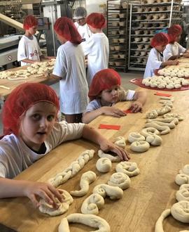 Gleich nach Ankunft wurden alle mit T-Shirts und Haarnetzen ausgestattet und konnten die Backstube betreten. Dort warteten schon zwei freundliche Mitarbeiter, die über die beim Backen verwendeten Getreidesorten erzählten. Nach dieser Theoriestunde ging es aber endlich an den Teig! Unter Anleitung wurden kunstvolle Gebilde gefertigt, die anschließend auf Bleche gelegt und in den Backofen geschoben wurden. Während die Schnecken, Brezen und Zöpfe im großen Backofen professionell mit Dampfzugabe gebacken wurden, durften die Kinder die Backstube besichtigen, am Sauerteig riechen und die großen Backtröge mit den unterschiedlichen Rührwerken bewundern.