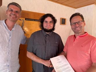 Der MGV Steinbach hat Stephan Sandmeier als neuen Chorleiter verpflichtet; kürzlich fand die Vertragsunterzeichnung mit der Vorstandschaft statt (v.l. Stefan Harbeck, 2. Vorstand, der neue Chorleiter Stephan Sandmeier und Dieter Grund, 1. Vorstand).
