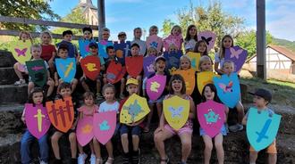 Im Anschluss wurde ein Ritterschild gebastelt und kreativ gestaltet, Ritterspiele gemacht und echte Ritterutensilien, wie Kettenhemd, Ritterhelm, Handschuhe angeschaut und auch mal ausprobiert. Zu Essen gab es, wie in der Geschichte auch, leckere Pizza. Für den Durst gab es Saft und Wasser und bei der Hitze noch Wassermelone.