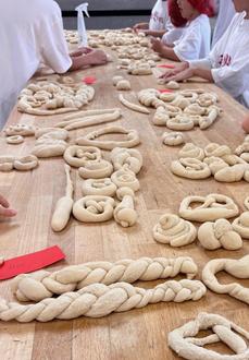 Unter der Anleitung von zwei freundlichen Bäckern wurden dann aus dem Teig Brezen, Schnecken, Zöpfe, Mäuse, Herzen und noch viel mehr gezaubert. Und endlich konnten die Werke aufs Blech gelegt werden und kamen in den Backofen. In der Zeit, in der die Kinder gespannt auf ihre fertigen Produkte warteten, konnten sie sich bei einem Getränk erfrischen und noch ein bisschen im Betrieb umschauen. Und dann war es soweit: aus dem Backofen kamen die duftenden Gebäckstücke, die auch gleich zum mit nach Hause nehmen in Tüten verpackt wurden.