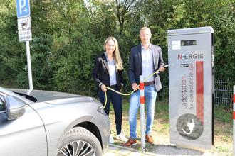 Bürgermeister Holger Bezold hat gemeinsam mit Sonja Olbrich, Betreuerin für kommunale Kunden bei der N-ERGIE Aktiengesellschaft, die Ladestation offiziell in Betrieb genommen.