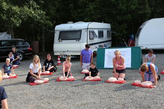 Am Sonntagmorgen hatten wir Besuch von den „First Respondern Dormitz“. Es wurde nach einer ausgiebigen theoretischen Unterweisung praktisch an Dummies die Wiederbelebung, beziehungsweise lebensrettende Maßnahmen geübt. Fachlich standen dabei wieder Dr. Tom Hartel (Rettungsarzt), Elke Bezold (Ausbilderin Rettungssanitäter) sowie Elke Müller (Rettungssanitäterin) zur Verfügung. Elke Bezold hat im Anschluss noch das Anlegen von Verbänden und deren verschiedene Einsatzmöglichkeiten geübt.