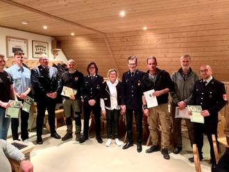 Im Anschluss wurden fördernde Mitglieder und Aktive geehrt. Dies waren für 40 Jahre Rudi Hueber und 15 Jahre Klaus Fischer sowie der langjährige 2. Kommandant Roland Knoll (jeweils fördernde Mitglieder) und für ihren aktiven Dienst Thomas Wolfrum (30 Jahre) sowie für jeweils 10 Jahre 2. Kommandant Andreas Nüsslein, Nick Marsing, und Tom Fischer.