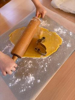 Ein weiterer Programmpunkt war das Backen von Osterplätzchen. Die Kinder hatten großen Spaß daran, den Teig auszurollen, Formen auszustechen und die Plätzchen später zu verzieren. Dabei entstanden viele leckere und schön gestaltete Osterplätzchen.