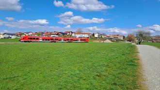 Intervall: Ab Durach ganztags stündlich, mit Umstieg von 7 Minuten in Kempten Hbf, nahezu immer am selben Bahnsteig! Die Gesamtfahrtzeit beträgt jeweils 1h 20 Minuten. Bei den eingesetzten Fahrzeugen handelt es sich um modernste Triebwagen der Bauart PESA mit Niederflureinstieg (Bauart wie hier zwischen Kempten und Pfronten), bestens auch für die Fahrrad-Mitnahme geeignet.