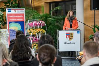 Bei der Einbürgerungsfeier im Landratsamt in Sonthofen feierten rund 50 neu Eingebürgerte mit Gästen, Familien und Mitarbeitenden des Landratsamtes die Übergabe ihrer Einbürgerungsurkunden.