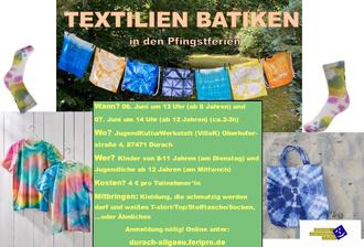 Hier die Aktionen in den Pfingstferien: Achtung!! Veränderte Uhrzeit beim Batiken!!