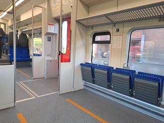 Nicht alles ist gar ist gut an den neuen Triebwagen VT633, einen großen Vorteil aber bieten die PESA aus polnischer Produktion mit deutschen Zulieferkomponenten, nach offiziellen Angaben gibt es Platz für bis zu 21 (einundzwanzig) Fahrräder! Oben im Bild der mittlere Einstieg mit den Fahrrad-Symbolen links und rechts, achten Sie beim Einstieg bitte darauf bei welchen Türen Fahrrad-Symbole angebracht sind! Unten im Bild der Innenraum mit einem der Fahrrad-Stellplätze entlang den Klappsitzen und den Befestigungsösen für die Räder, bitte die Spannseile dafür nicht vergessen.