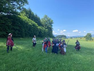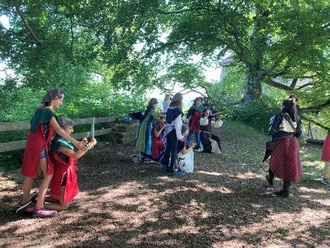 Am zweiten Tag wurden von Relian von Lindenberg unserem Krieger und Juli Rosenfeuer, der Kriegerin grundlegende Kampftechniken für den Ernstfall eingeübt. Nach den drei Grundregeln eines Kriegers: „1. Nicht Reden. 2. Gib immer dein Bestes! Gib niemals auf! Ehre deinen Gegner/deine Gegnerin! und 3. Vom Einfachen zum Schwierigen. Alles baut aufeinander auf.“- sollten alle Teilnehmer*innen stets handeln. Nach einer kleinen Mittagsstärkung erlernten die Kinder weitere Techniken für den Ernstfall. Dieser trat dann auch schneller ein als erwartet, die Schemen griffen erneut an und einige der angehenden Kriegerlehrlinge mussten „einschlafen“ (die Macht der Schemen). Zum Glück hatten wir auch Arlinn unsere Heilerin dabei, sie konnte die „Gefallenen“ wieder zum Leben erwecken.