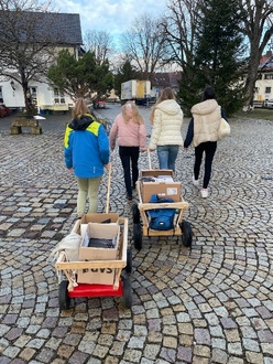 Die Klasse 9cM hat sich auf den Weg nach Weidach gemacht, die Weihnachtskarten mit Leiterwägen dorthin transportiert und dann verteilt. Für das Seniorenzentrum in Durach überbrachte die Klasse 8a mit den Weihnachtskarten auch noch selbstgebackene Plätzchen, die sie im Fach Ernährung und Soziales gebacken hatten. Die Freude war sehr groß.