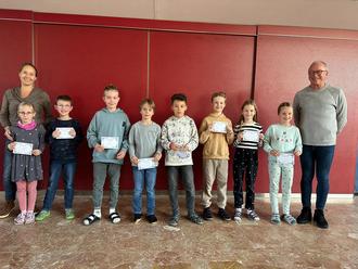 Von links: Nina Hägele (2. Siegerin 2.Kl), Manuel Eltrich (1. Sieger 2.Kl), Jonas Rietzler (3. Sieger 3.Kl), Noah Yagci (2. Sieger 3.Kl), Mateo Hailer (1. Sieger 3.Kl), Oscar Vogl (3. Sieger 4.Kl), Maximilian Wegscheider (2. Siegerin 4.Kl), Lilia Staiger (Schulsiegerin)
