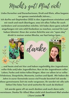 Ich sag´ Danke, an alle, die mir in meiner Zeit als Gemeindejugendarbeiterin von Durach begegnet sind! Und wünsche mir von ganzem Herzen, dass der Jugendtreff weiter bestehen bleibt, dass weiterhin Angebote, sowie ein tolles Ferienprogramm stattfinden und die Kids und Jugendlichen aus Durach eine gute Zeit im Treff haben können!