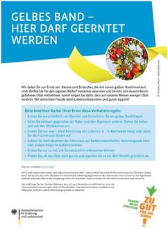 Die Aktion „Gelbes Band“ hat das Ziel, dass mehr Obstbäume in Deutschland vollständig abgeerntet werden. Ein gelbes Band am Obstbaum signalisiert: Hier darf kostenlos und ohne persönliche Rücksprache mit dem Eigentümer geerntet werden.