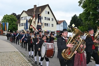 Der Wettergott hatte ein Einsehen, als es anschließend mit der Musikkapelle und den Fahnenabordnungen zum Gedenken ans Bauernkriegsdenkmal ging.