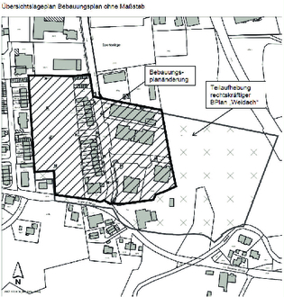 Der räumliche Geltungsbereich ist in beiliegendem Übersichtslageplan dargestellt und umfasst eine Fläche von ca. 3,3 ha (Bebauungsplanänderung) zzgl. einer Fläche von 2,85 ha für die Teilaufhebung des rechtskräftigen Bebauungsplanes „Weidach“. Das Plangebiet liegt im Ortsteil Weidach an der Werner-von-Siemens-Straße, zwischen der Duracher Straße im Süden, der Siedlung Weidach im Westen, der Umgehungsstraße im Osten und dem Gewerbegebiet Durach-West im Norden.