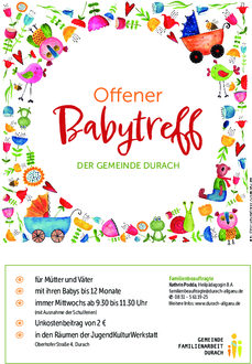 Der nächste Offene Babytreff findet, am 14.09 um 9.30 bis 11.30, wie gewohnt in der JugendKulturWerkstatt statt. Hierzu möchte ich alle interessierten Mütter und Väter mit ihren Babys bis 12 Monate einladen.